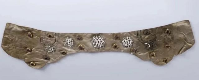 明朝王洛家族墓的额帕是目前发现的比较完整的文物额帕,上面装饰着晶石、珍珠、刺绣,图案丰富,造型贴合头型,证明它在当时的女装中也曾经辉煌过。