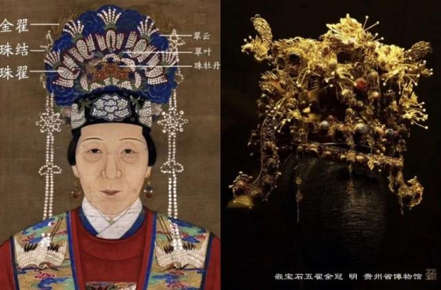 我们来看看翟冠的细节。从画像上看,用点翠、珠翟等装饰得相当华丽,头上会插一对金翟。除了这个常见的流行版本,还有一个华丽的混搭版本。目前贵州博物馆嘉靖五翟金冠整体以黄金为基础,复古风格加上隋朝风格的下垂弯曲风格。
