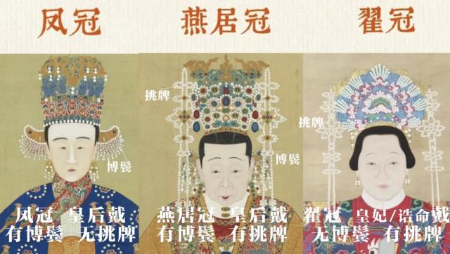 在明代不同级别的夫人画像中,我们经常可以看到这样的凤凰。 / 翟冠,两边都会搭配挑牌,挑牌通常是由不同形状的珠子结构成长的一串,两边对称一对配戴,一般是皇后。 / 皇妃 / 女人可以佩戴,不同场合佩戴的皇冠和饰品也不一样。下垂的选择被称为“珠结”。简单来说,就是用线把珠子穿成各种形状的结来装饰。
