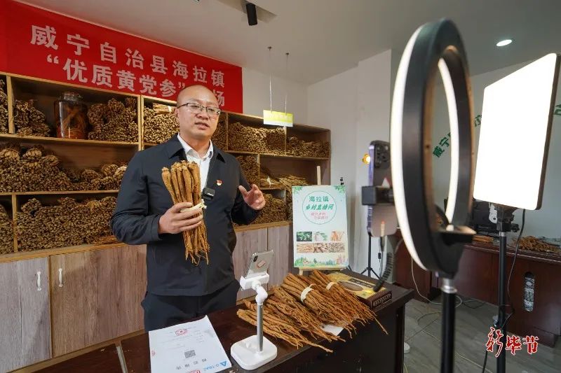 他手持党参,操着一口不太标准的“毕普话”:"海拉党参大多产于辖区内的平梁子和中辉梁子,换言之,我们就把整座山梁‘搬’进了直播间."