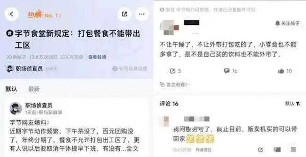 字节跳动被曝福利调整:各地严禁打包餐食回家。 禁止午休时关灯