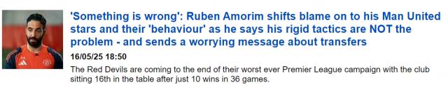 即使曼联获得了欧联杯冠军,获得了欧冠资格,本赛季也不合格,因为他在英超的表现令人失望。主教练鲁本 · 阿莫林认为,这只能归功于球员,他们有问题。(Something is wrong)。阿莫林的矛头,直指球员的行为态度。