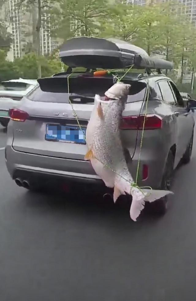 最近,广西贵港一名男子在车尾绑了一条大鱼游街,不少当地网友表示,在街上遇到了这辆车,引起了热议。
