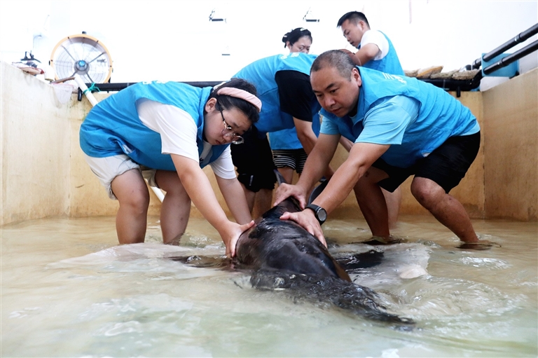 “通过科技治疗,海豚状态稳定,逐渐好转。”当谈到搁浅的粗糙牙齿海豚什么时候可以放回海洋时,王振宇说需要很长时间,包括稳定的身体状况和野生训练。“我们也坚信这只搁浅的粗糙牙齿海豚有着和海棠一样的运势。”