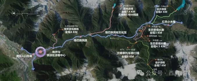 图为南伊沟景区路线图(目前久措和红色小屋还没有向游客开放)。