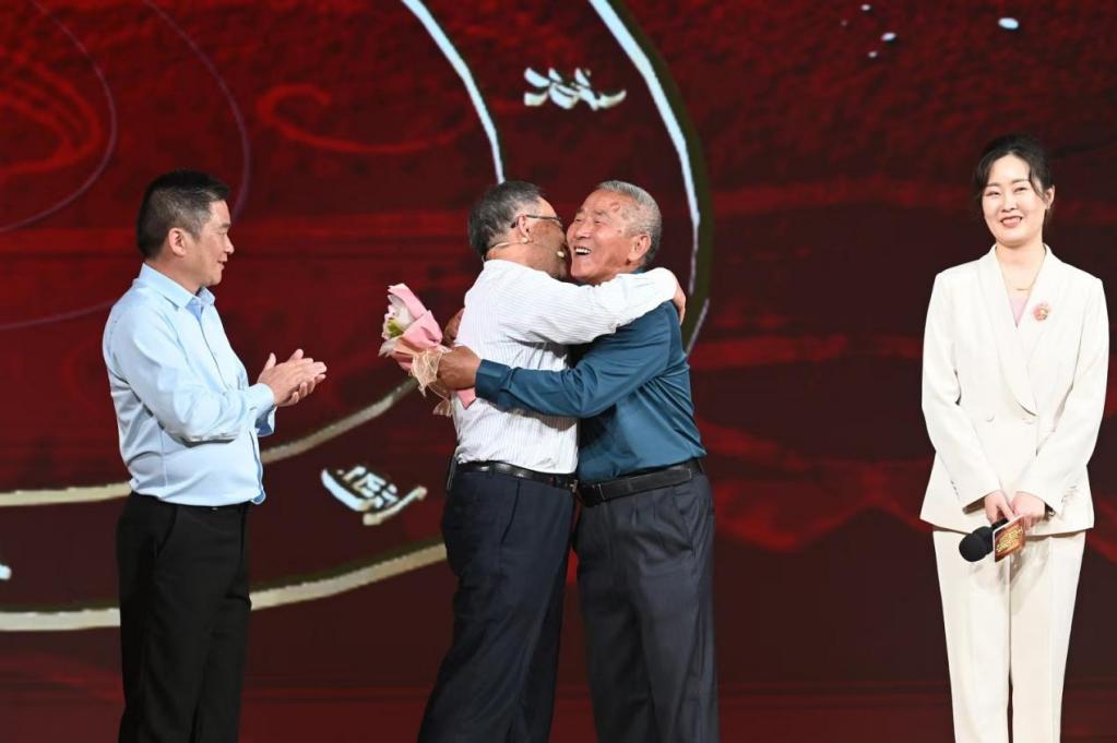 活动中,“江南第一牡丹”第22代守护人金书林家庭现场讲述了传家宝牡丹花的故事。董其昌在上海的后裔也来到了现场。在舞台上,两位古老的老人真诚地拥抱了这位500年前遵守诺言的老人。与此同时,奉贤淞桥学校合唱团演唱了《牡丹花开》。活动前,金书林的儿子金国强和孙媳纪文琴向澎湃新闻记者讲述了金家“花语传家”背后的温暖与传承。