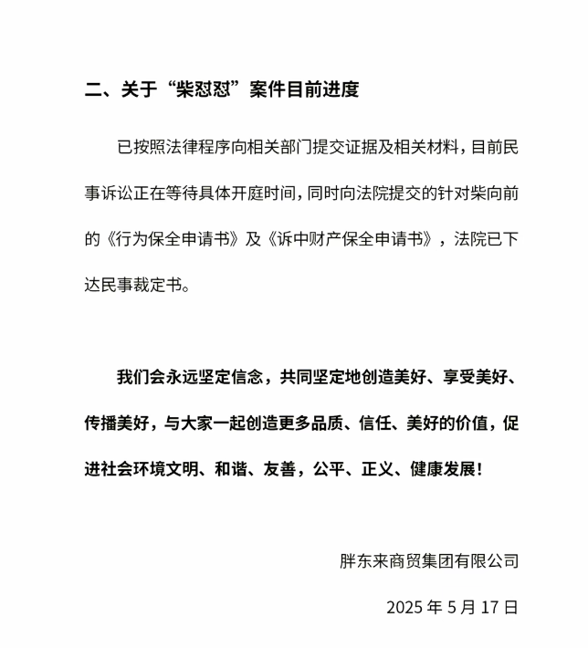 胖东来在公告中表示,“柴火”案件已按照司法程序向有关部门提交证据及相关材料。目前,民事诉讼正在等待具体的审判时间。与此同时,法院已向法院提交《行为保全申请书》和《诉讼中财产保全申请书》,法院已发布民事裁定。