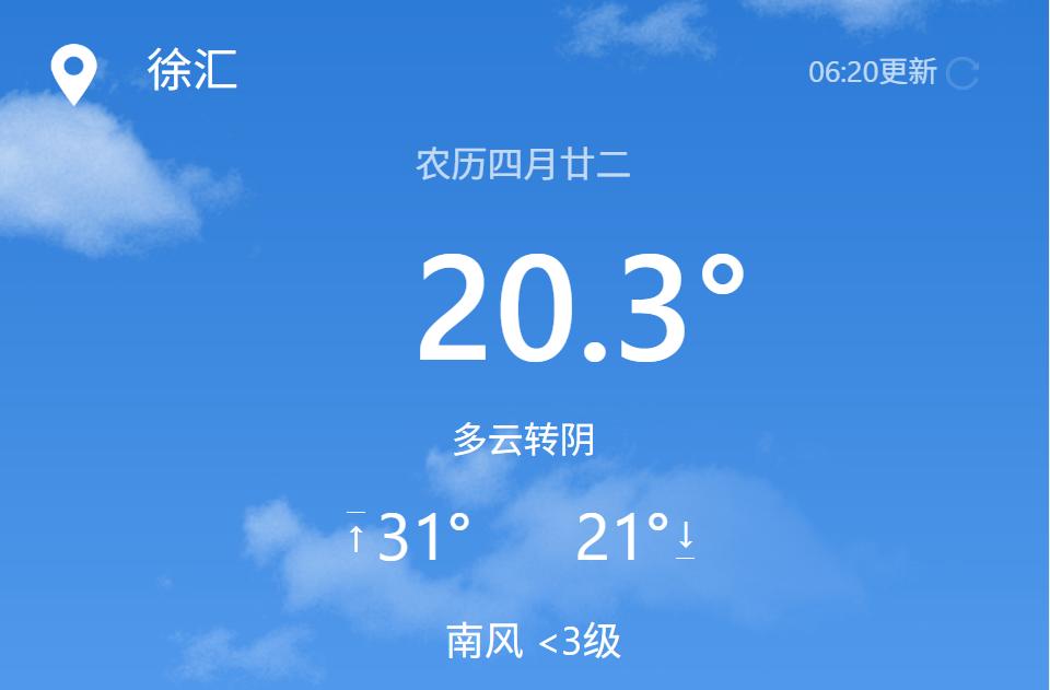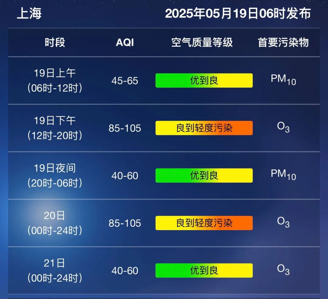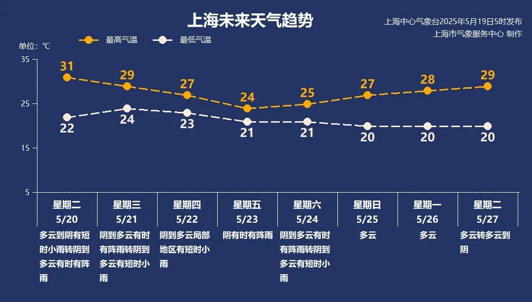 今日上海(5月19日)多云至晴,早间全市最低气温为19日。~21℃之间。在白天的阳光下,温度迅速上升,预计最高温度可达31℃。南至东南风3~四级,相对湿度90%~40%。白天气温高,湿度高,中午体验难免会有点热,大家出门做好防晒补水。