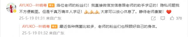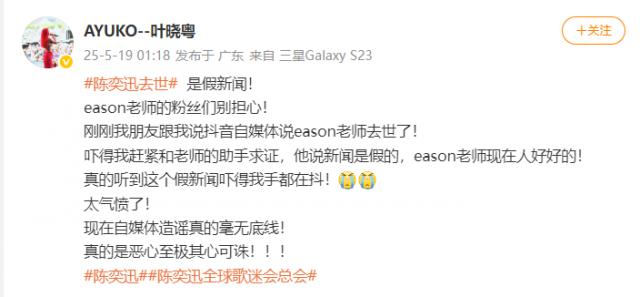 5 月 19 日本,歌星叶晓粤发文称陈奕迅去世是假新闻。叶晓粤说,他和陈奕迅的助手证实了“去世新闻”是假的,他现在很好。