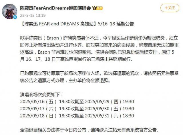 此前,5 月 15 日,陈奕迅 Fear and Dreams 巡回演唱会官方微博发布延期公告: