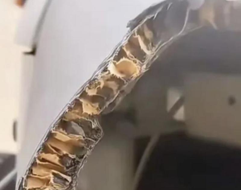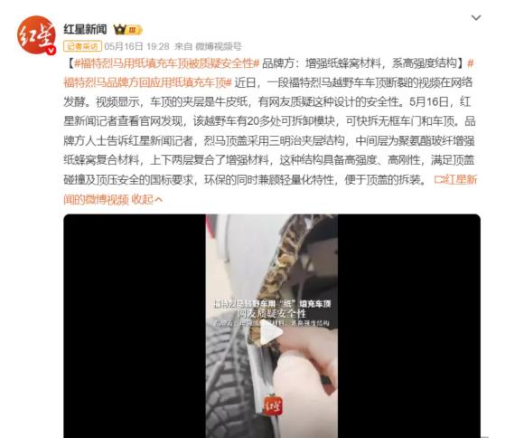 事情是这样的。就在最近,一段福特烈马越野车车顶断裂的视频在社交平台上疯传。图中,车顶隔层裸露的蜂窝材料被网友质疑存在安全隐患,因为它们看起来像“牛皮纸”。