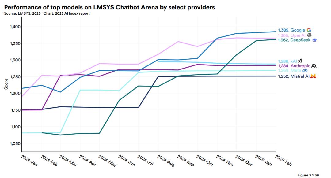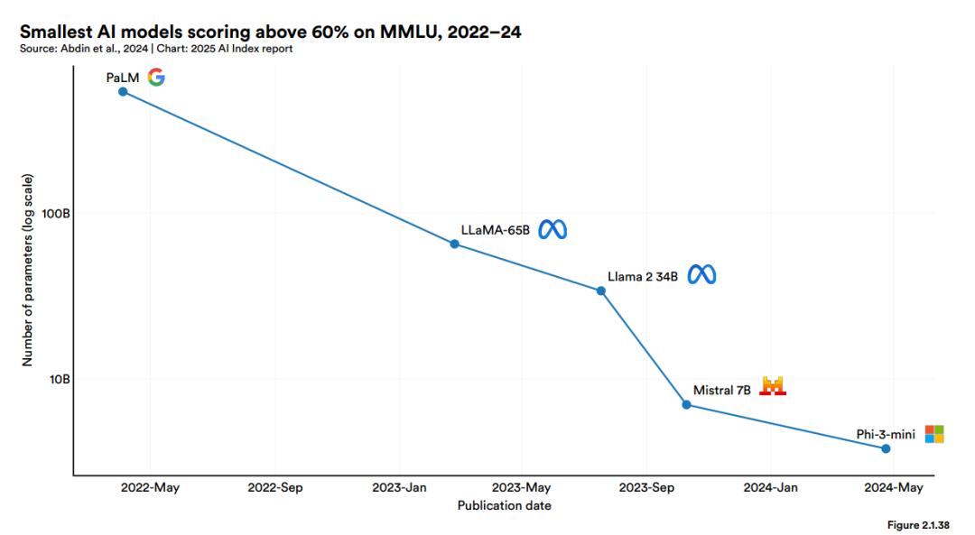 2022年11月至2024年10月,在性能日益强大的小型模型的推动下,系统推理成本达到GPT-3.5水平,降幅超过280倍。就硬件而言,成本每年降低30%,而能源效率每年提高40%。在一些基准测试中,开源权重模型也在缩小与闭源模型的差距,一年内性能差距从8%缩小到只有1.7%。总的来说,这些趋势正在迅速降低先进AI的应用门槛。