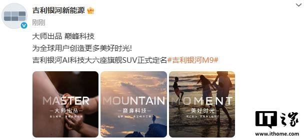 IT 世家 5 月 19 今天,吉利银河宣布“ AI 六大技术旗舰 SUV “吉利银河正式命名 M9,关键字是“大师制作”“巅峰科技”“美好时光”。
