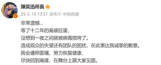 接着,陈奕迅本人也在社交平台上发了一条道歉信息,表示将遵医嘱,努力恢复健康,尽快重返舞台。
