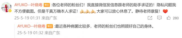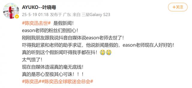 5 月 19 日凌晨,歌星叶晓粤通过微博认证帐号 @AYUKO-- 叶晓粤 在得知网爆“陈奕迅去世”的消息后,她立即联系了陈奕迅的助手,对方确认这个消息是谣言,并指出“ Eason 老师现在很好”。