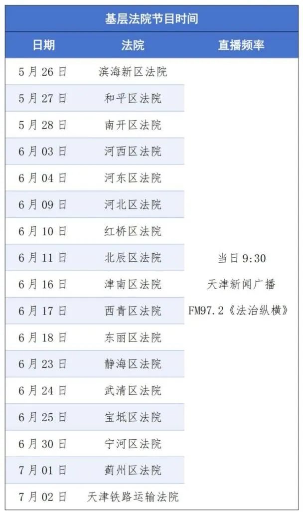 全市17家基层人民法院院长将于5月26日至7月2日(每周一至周三)参观天津新闻广播节目(FM97.2 请继续关注AM909)。