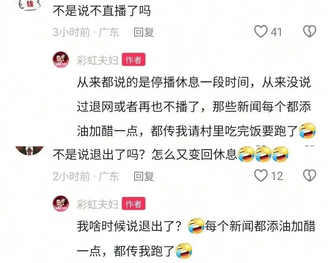 对此,彩虹夫妇回应说:“我们从来不谈停播休息一段时间,也从来没有说过退网或者再也不播了。”对于外面的谣言,他们说的只是新闻。