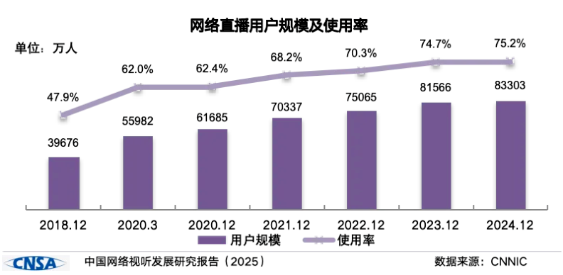 淘宝就是这样,尤其是抖音、快手等平台。根据《中国网络视听发展研究报告(2025)》,截至2024年12月,我国网络直播用户数达到8.33亿,职业主播数达到3880万,同比增长1.5倍。即使电商主播只占10%,也有几十万甚至上百万人。