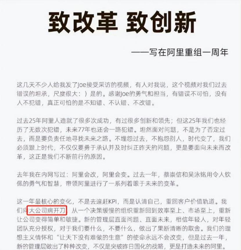 阿里在2023年打开“11” 6 N“企业变革的时候,阿里内网出现了一个热门帖子“我们拆了什么”,员工吐槽“拆网”把阿里切成不互通的模块,严重影响了组织效率。更早的时候,有一个关于阿里管理体系和PUA文化的热门帖子,只从事形式主义。