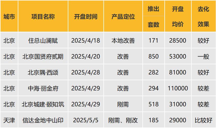 据统计,2025年4月14日至2025年5月11日,主要监测了北京角西颂、北京城建、颐知筑、中海丽金府三个纯新开楼项目。老盘新开了两个:住总山澜赋、北京国贤府二期。