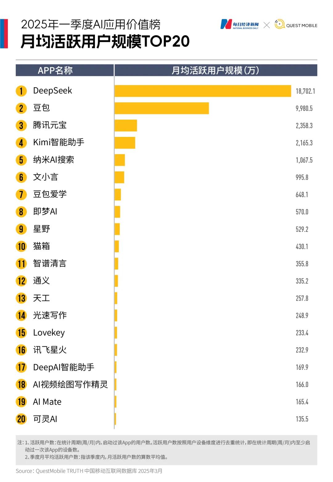 举例来说,腾讯的原生AI商品元宝在17天内更新了7次高频迭代闪电战,以及混元、DeepSeek的双模驱动,实现了用户的显著增长。根据Questmobile的数据,2025年第一季度,腾讯元宝在下载量和MAU方面均位列前三,月平均下载量达到1343.3万,较上年同期增长近1500%,增幅排名第一;MAU为2358.3万,较上年同期大幅增长1546%,增幅排名第二。