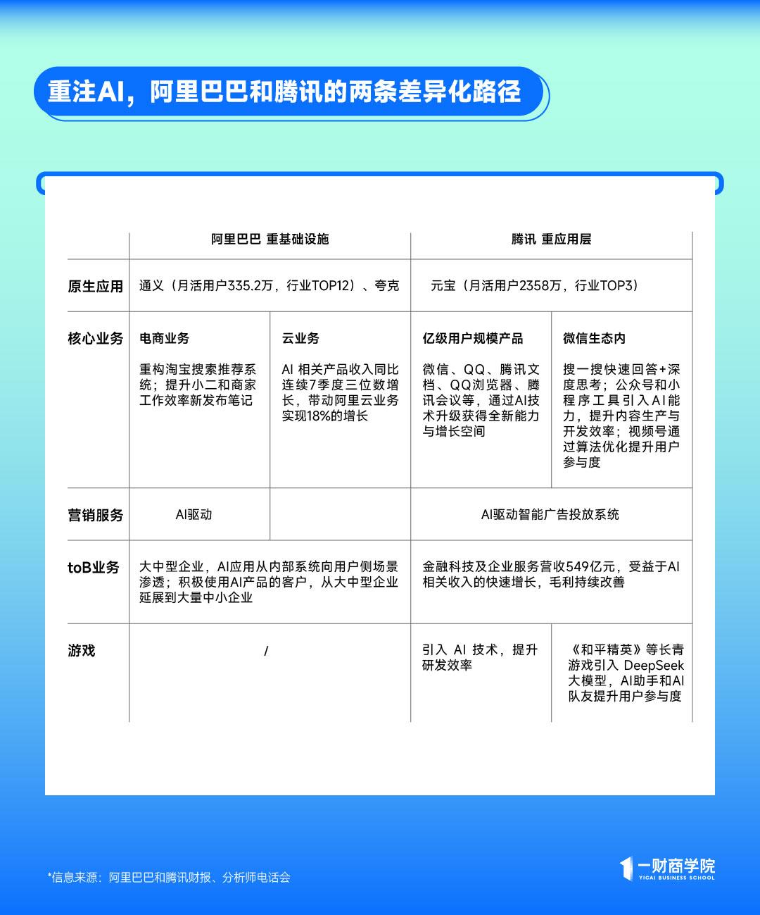 对于阿里来说,电子商务作为垂直类别,不占领因特网入口。。而且专注于AI,可以实现入口突破,增加更多人;对于腾讯来说,AI是社交和游戏等核心业务增长的底层逻辑。——当游戏、广告面临增长瓶颈时,AI将成为优化用户体验、提高商业化效率的关键变量。