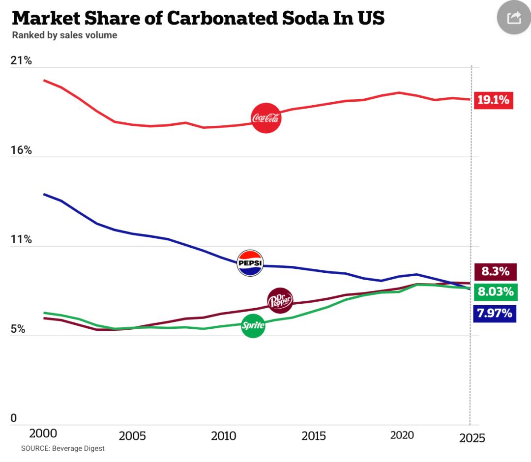 近几年来,美国汽水市场格局持续波动。根据《饮料文摘》的最新数据,雪碧在2024年以8.03%的市场份额超过百事可乐(7.97%)跃居第三,胡椒博士(Dr Pepper)然后以8.3%的份额稳居第二,这意味着百事可乐首次迭出市场前三。