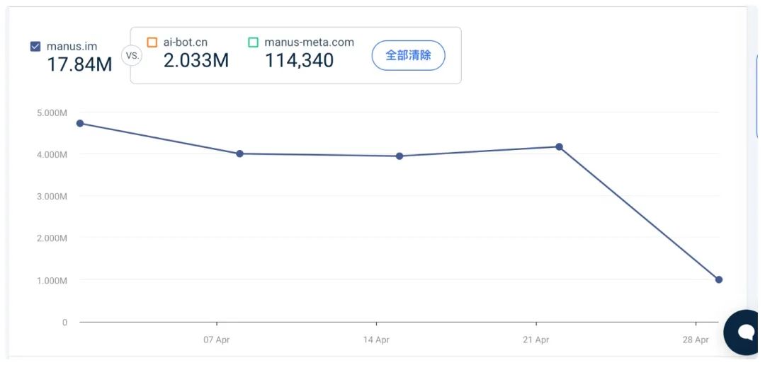 图|Manus周全球浏览量2025年4月,图源SimilarWebebe