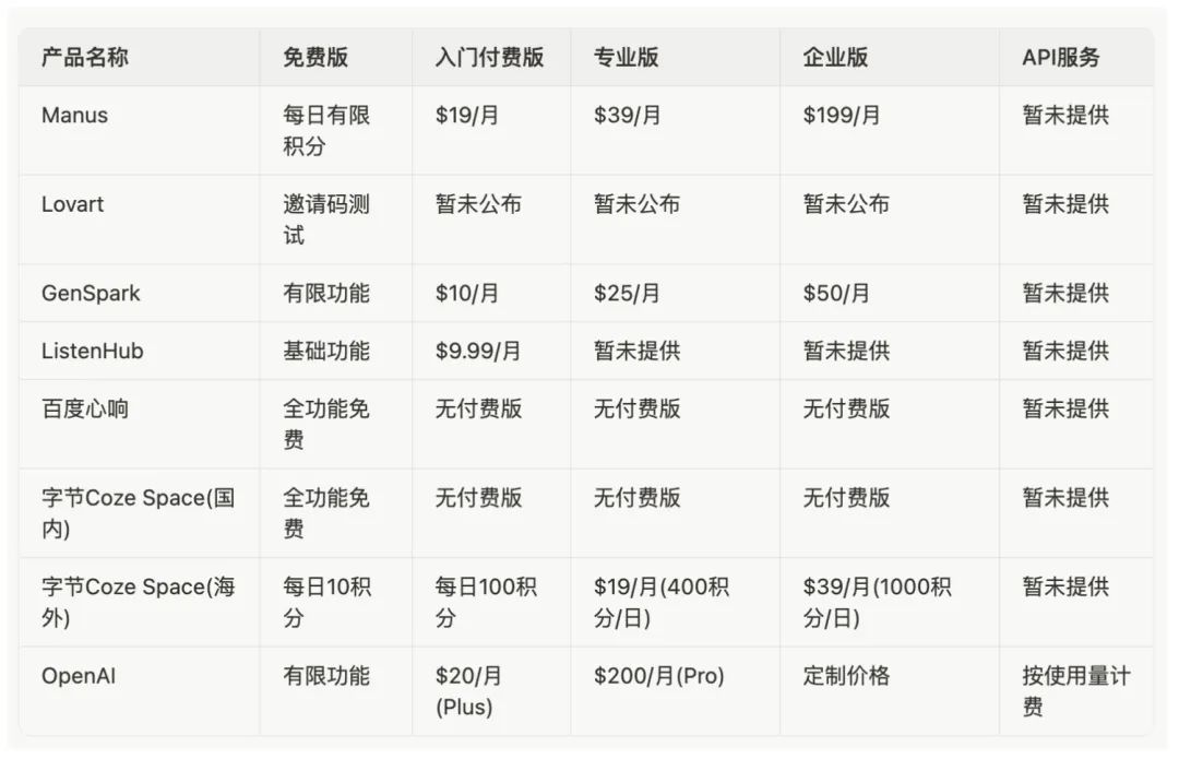 同时,Genspark也在市场上涌现。、Lovart、Coze Space等各有千秋的Agent类产品,字节、百度等大厂注定不会错过这一轮热潮。