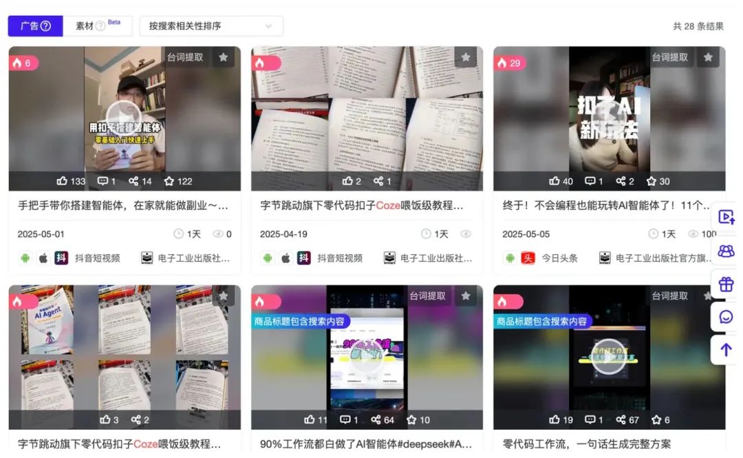 以字节Coze为例,AppGrowing显示,在4月17日至5月17日的一个月里,以“无编程生成智能体”、“零代码”等关键字为标题的短视频素材频繁出现在抖音平台上。