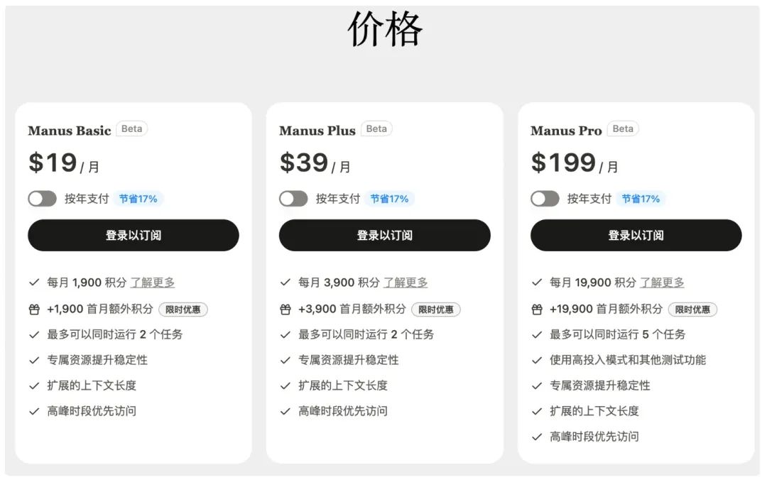 三月二十八日,Manus正式推出支付计划,最初提供两种订阅机制,即每月39美元的Starter级别和每月199美元的Pro级别。Manus还为不同的深层群体增加了每月19美元的支付水平。