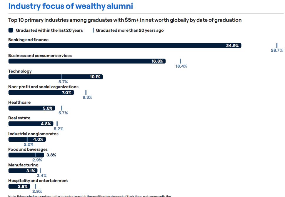 近20年毕业的高净值学生几乎是20多年前毕业生的两倍,他们把科技作为自己主要行业的重点。