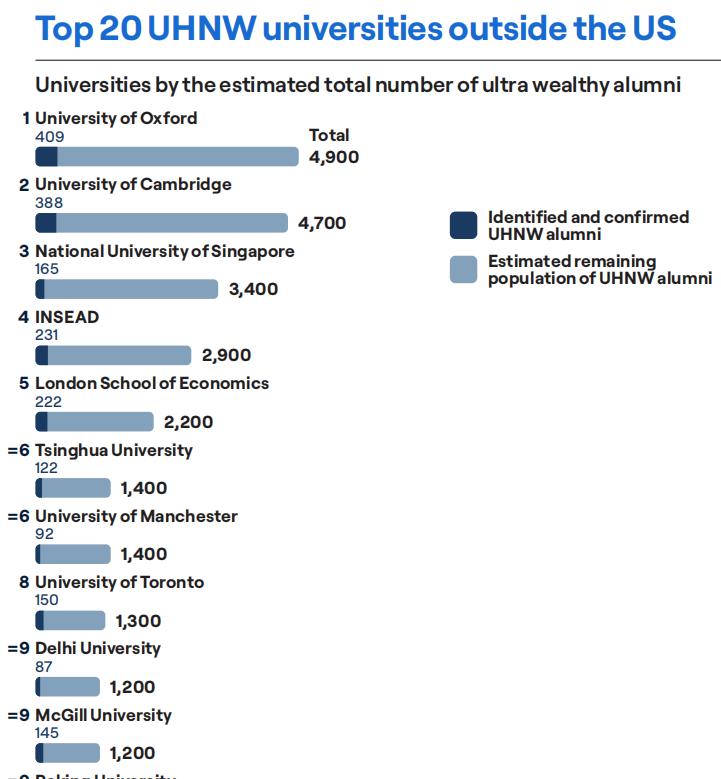第三,牛津大学在非美国大学的富裕学生中排名第一,其超高净值学生人数约为4900人。剑桥大学以约4700名超高净值学生排名第二。