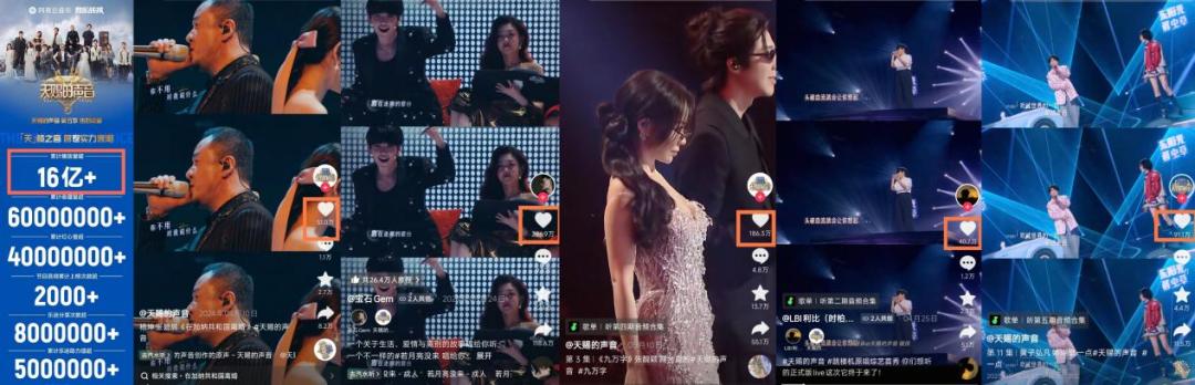 与“歌星”相对应的,是以“天赐之声”为代表的大众化音综。最近两季“天赐”的选曲,更多来自抖音热歌。一方面是浙江卫视与抖音整体合作升级,另一方面也代表了观众的选择。就音乐的传唱程度而言,“天赐”更了解其中的规律。无论是上一季的《若月亮没来》、《在加纳共和国离婚》,还是本季的《跳楼机》、《一点》、《九万字》等等,都是抖音中数十万甚至数百万的赞数。网易云音乐,上一季累计播放音乐超过16亿,累计收藏超过6000万。这个串串的数字,也足以证明“天赐”中音乐在大众传播中的成功。