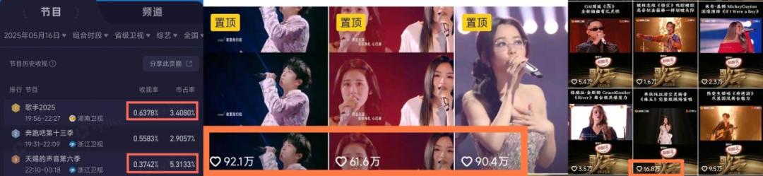 一方面是对艺术性的坚持,另一方面是对唱功的加码。两种不同类型的音综有完全不同的基础,观众已经选择了“分界点”。星期五播出了“歌星”和“天赐”,在电视端前者以0.6%的收视率排名第一,但如果对比两个官方抖音账号的点赞数,“天赐”当期的演唱卡段点赞数已经超过百万,“歌星”的演唱卡段点赞数目前为“珠玉”的16.8万。