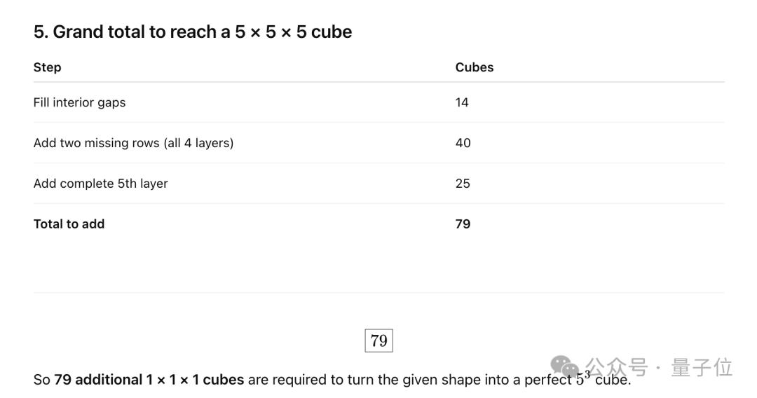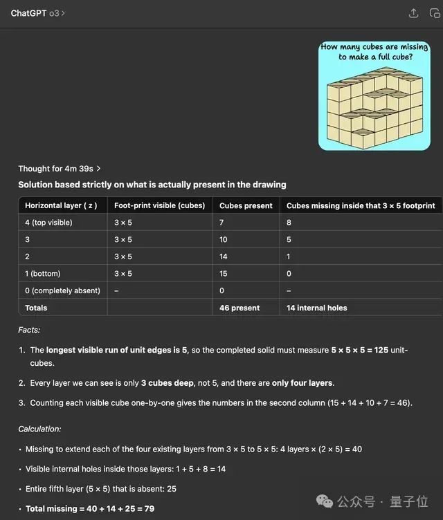 o3将最终形成的大方体规格理解为5x5x5,但它仍然对缺失的小方体数量给出了错误的答案。从人类的角度来看,形成5x5x5的大方体需要125个小方体,图中已经给出了46个,所以答案应该是79个。