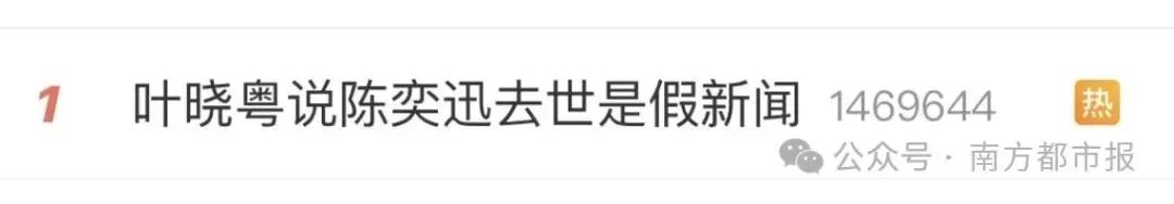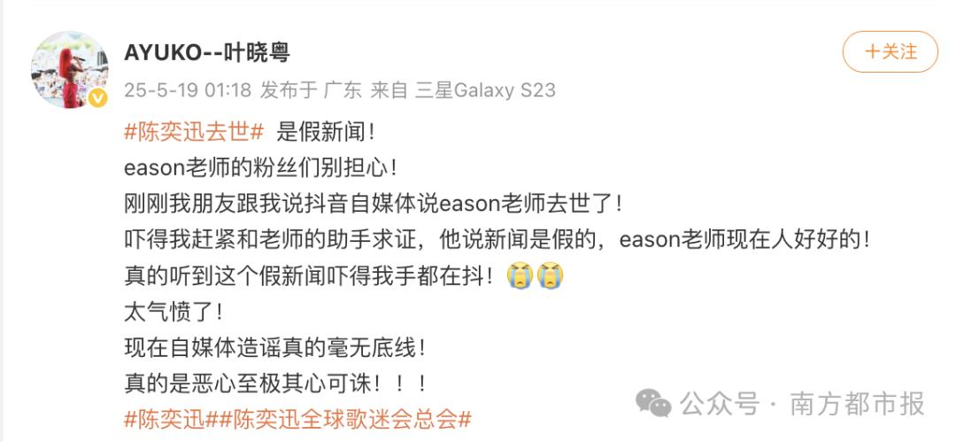 今日上午,“叶晓粤说陈奕迅去世是假新闻”也冲上热搜第一,引起关注。19日1时许,@AYUKO--叶晓粤 发帖称是假新闻,“我赶紧跟老师的助理确认,他说新闻是假的,eason老师现在人很好!”