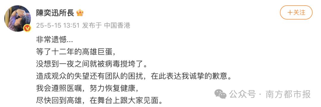 此前,陈奕迅团队于5月15日发布公告,称陈奕迅被诊断为新冠肺炎,停止了所有演艺活动并休息。陈奕迅本人也在社交平台上发了一条道歉信息,称他会遵医嘱,努力恢复健康,尽快回到舞台上。