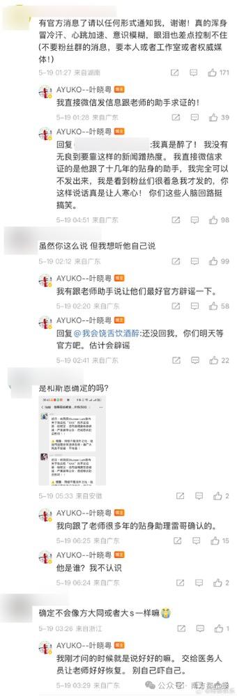 她还在评论区回应网友说:“我是和老师在一起很多年的个人助理雷哥决定的,也有人说最好官方辟谣。我没有黑心到要靠这样的新闻蹭流量。我根本不能发。我是看到网友着急才发的。”