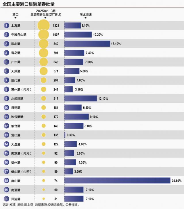 广州港有关负责人告诉南方财经全媒体记者,截至目前, 2025 年 4 月底,广州港集团共有集装箱船航线 222 条,其中外贸通道 177 包括“一带一路”方向航道。 152 条。2025 2024年第一季度,青岛港集装箱吞吐量位居全国第四, 今年上半年还增加了国际集装箱航道 12 条,其中五条以上变成了“一带一路”通道。
