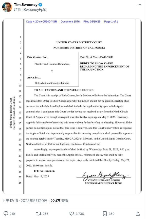 假如苹果在美国继续不批准堡垒之夜 App Store 或是,如果双方未能上架, 5 月 27 每天听证会前达成和解,苹果企业“负责合规事务的高管”必须亲自出庭。