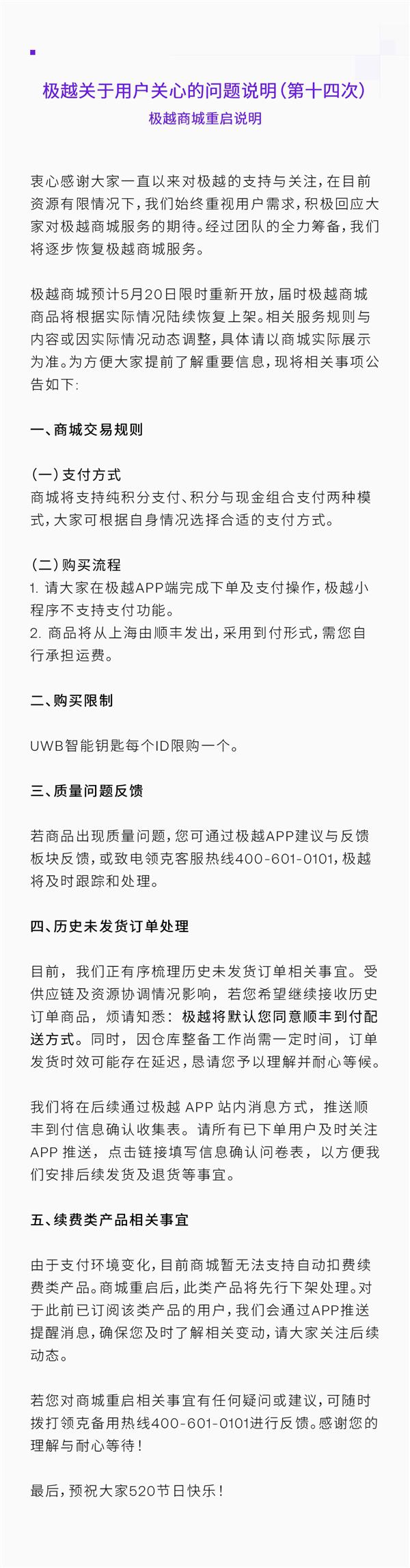 快科技 5 月 20 近日,极越汽车发布了客户关注的问题(第十四次)。