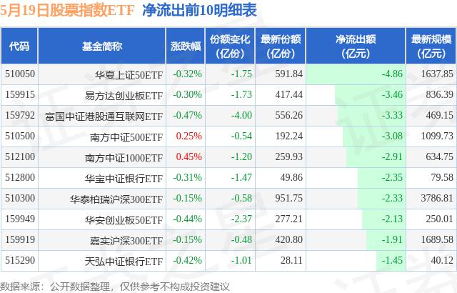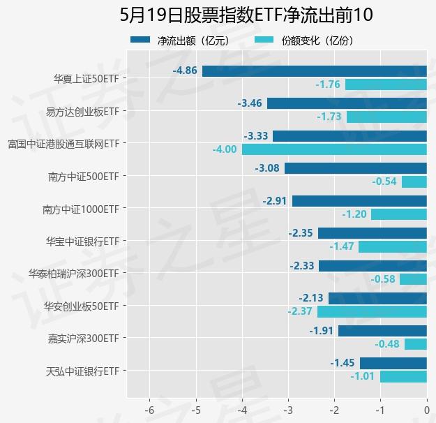 当天有 336 只股票指数 ETF 资金净流出的基金,其中华夏上交所净流出排名第一。 50ETF(510050)减少了份额 1.75 一亿份,净流出额为 4.86 亿元。