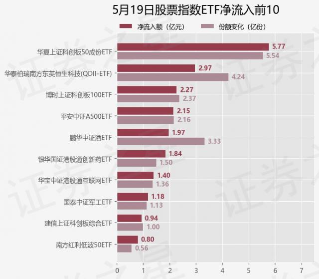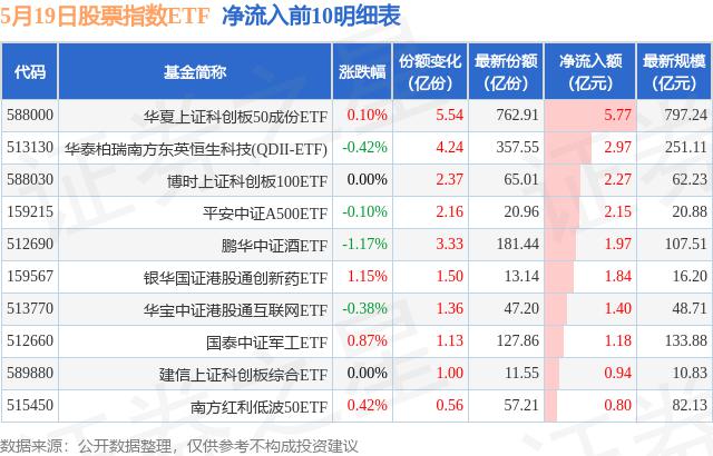 当天有 122 只股票指数 ETF 资金净流入出现在基金中,其中华夏上证科技创新板排名第一。 50 成分 ETF(588000),份额增加 5.54 十亿份,净流入额为 5.77 亿元。