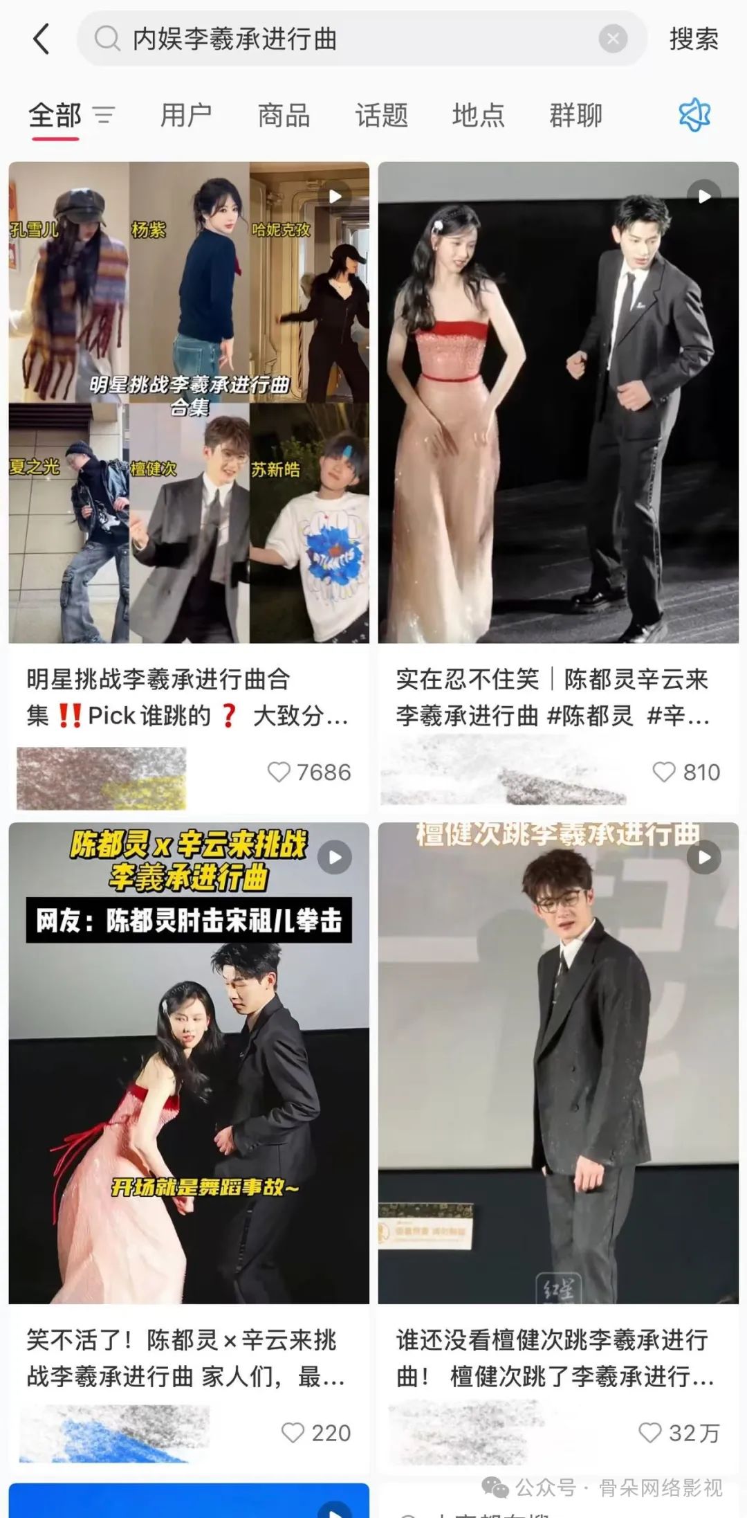 假设手势舞业务是早期的抖音流量密码,那么现在歌舞cha的流行就兼具了明星宣传新剧的任务。夏之光在cha的《成家》会议上,“竹林四侠”在cha的《永夜星河》直播中,《Spicy Honey》,陈都灵、檀健次、姚晨在各自新剧会议上Cha“李羲承进行曲”,不仅为播出剧集带来了短期的社会媒体热度,也帮助他们在人工设计的构建上增加了一个“有网感”的隐藏标签。