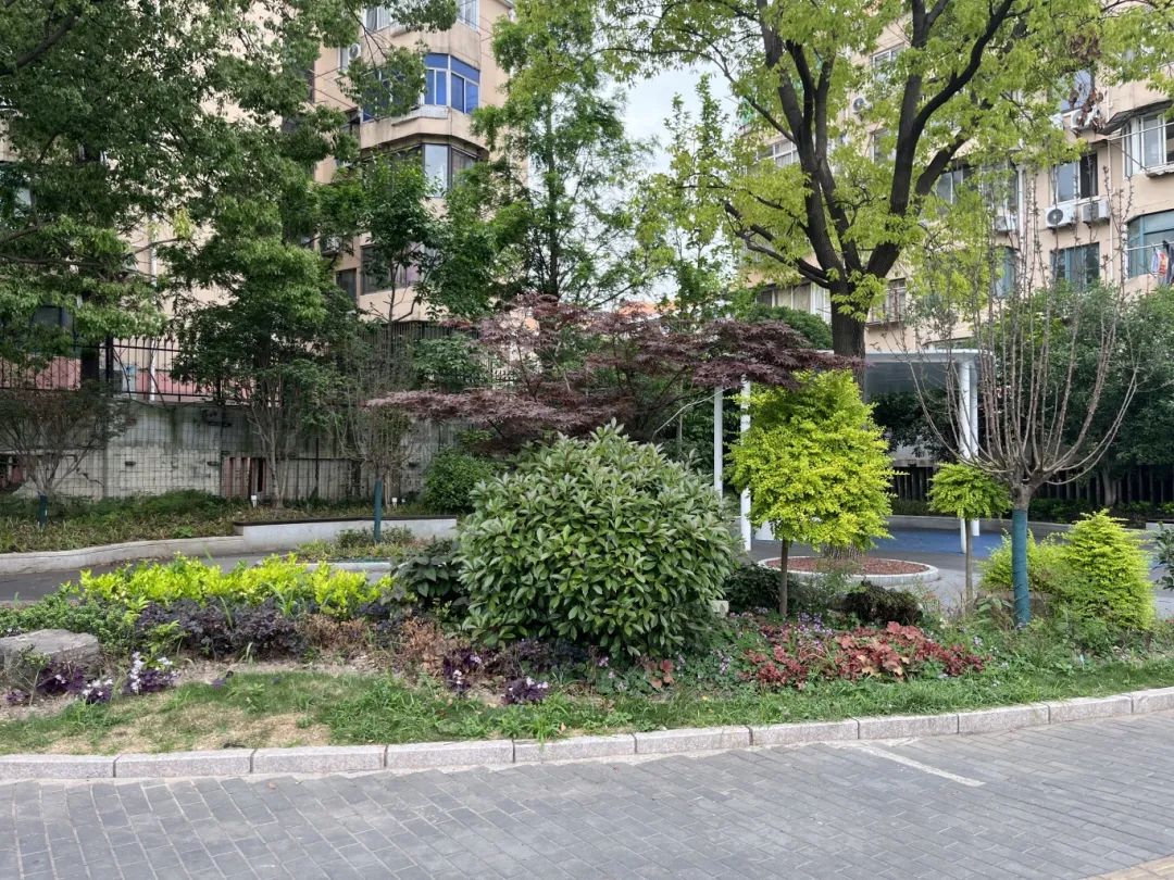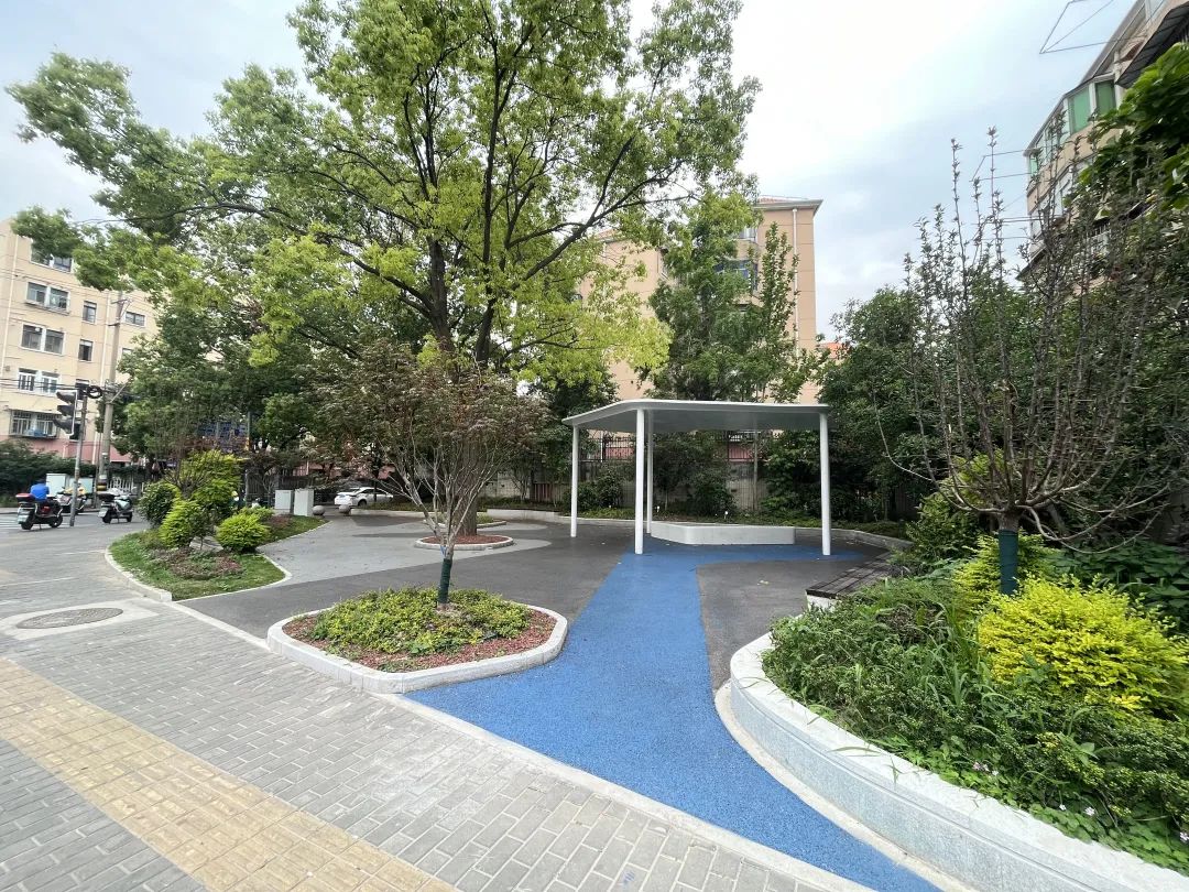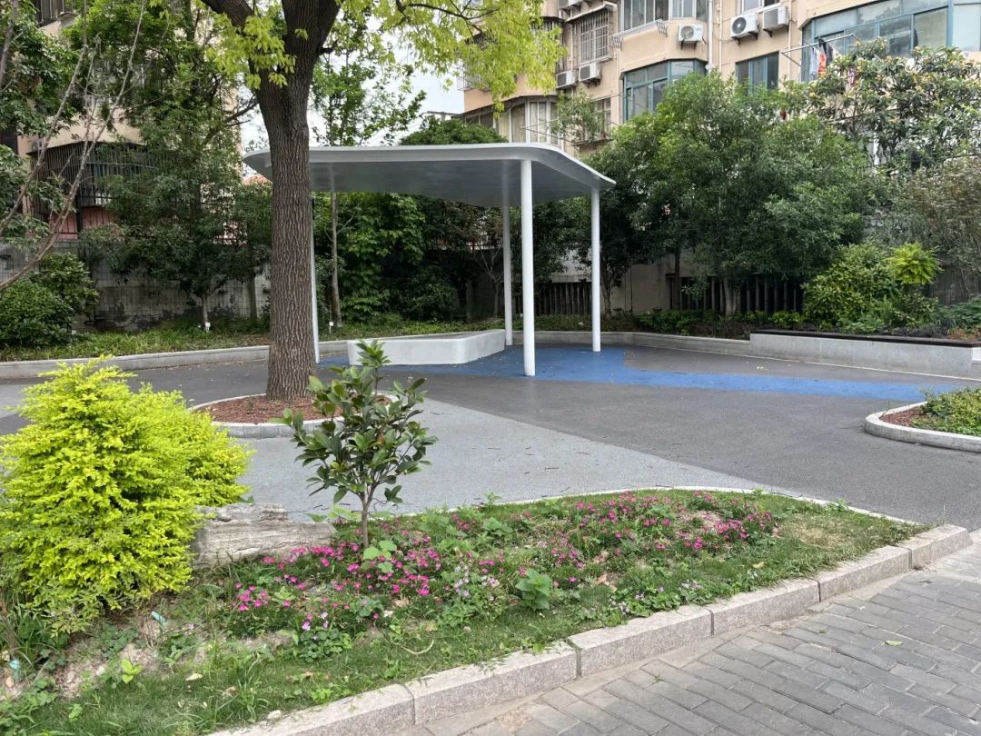 由于建设年限较长,改造前的街角绿化存在景观设施陈旧、空间布局不合理等问题。本次改造在保留原有乔木的基础上,对场地进行了系统的升级:拆除旧木廊架和景墙,代之以现代钢廊架;新增红枫、南天竹等彩叶植物和花、叶、玉簪等特色植被,形成层次分明的植物类型;彩色混凝土被完全更换为地面铺装,不仅提高了步行舒适性,还增强了海绵城市的功能。
