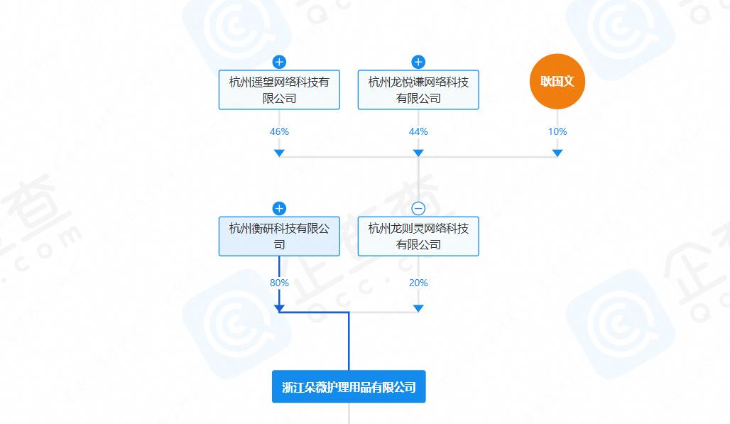 而且之所以能在这么快的时间内推出商品,源于朵薇本是一家专业生产卫生巾商品的厂家。根据企业调查,浙江朵薇护理用品有限公司(以下简称浙江朵薇)成立于2021年6月,2025年4月新增杭州龙则灵网络科技有限公司(以下简称龙则灵)为股东,拥有浙江朵薇20%的股份,黄子韬间接持有龙则灵44%的股份,龙则灵最大的股东是遥望科技的控股子公司。