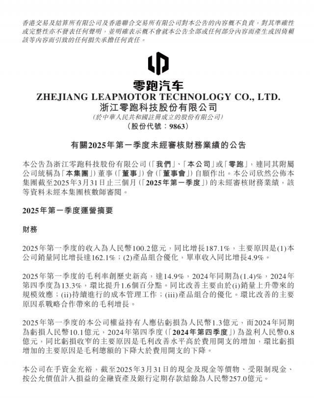 IT 世家 5 月 19 日报,零跑汽车今日发布 2025 年度第一季度财务报告,IT 世家从数据中了解到,期内销售额为 87552 台湾,同比增长达到 162%,3 月度位居中国新力量品牌销量第一;收入超过百亿,达 100.2 亿元,同比增长 187.1%;毛利率达 14.9%,创造历史新高。