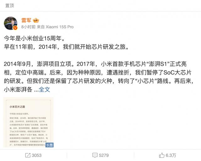 而且不难理解,芯片对手机的重要性早已显而易见,雷军在发文中表示:「一直有一颗小米『芯片梦』,因为,要想成为一家伟大的硬核技术企业,芯片是一个必须攀登的高峰,也是一场无法回避的硬仗。」