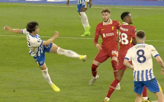 然而,他迅速调整了自己的身体姿势,进入了一个高难度的拧身腾空,利物浦门将阿利松束手无策。三薰协助布莱顿扳平比分,2-2。从那以后,士气高昂的布莱顿在 85 再一次破门,最后 3-2 拿下胜利。